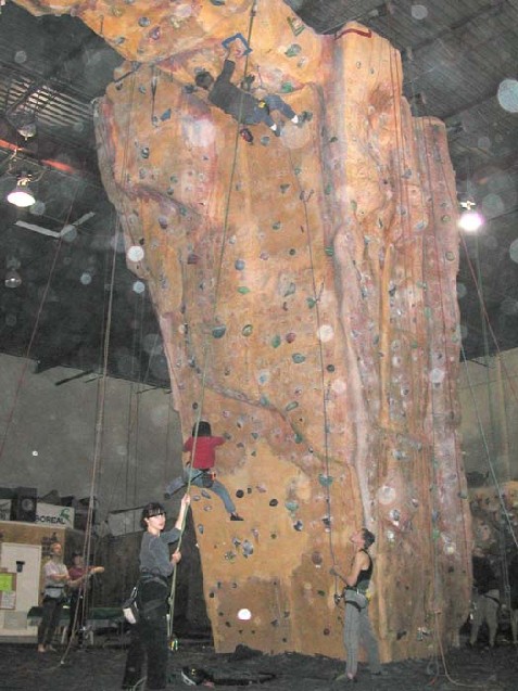 Андрей страхует Даню в скалолазном зале, рядом - Наталья